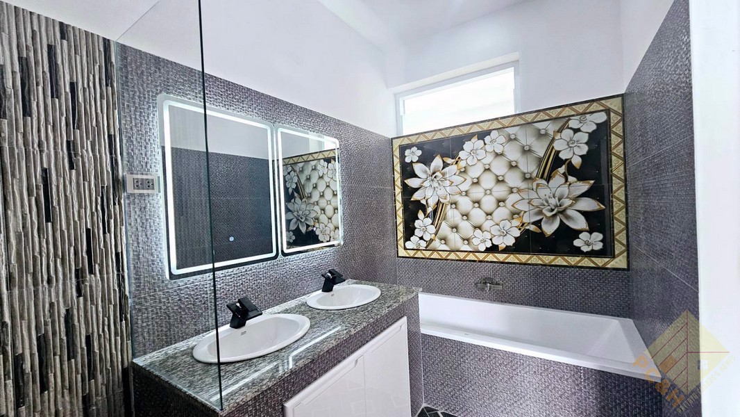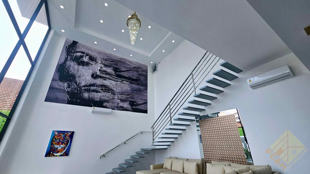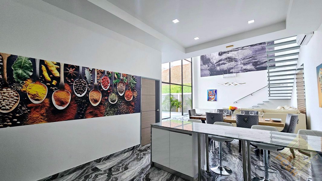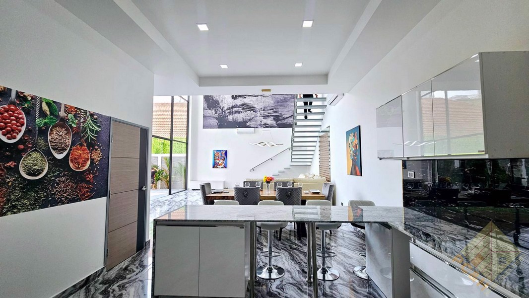 This property sits on an 80.5TW (322 sqm) land plot and has an 8-meter-long private pool. There is also a double garage, plenty of terrace space surrounding the pool and a small garden area too.