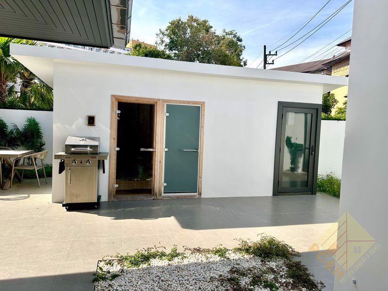 This house sits on 57.5 square wah (approximately 230 sq.m.) and features a sauna room, a steam room, and a private swimming pool enclosed by high walls, as well as covered parking.
