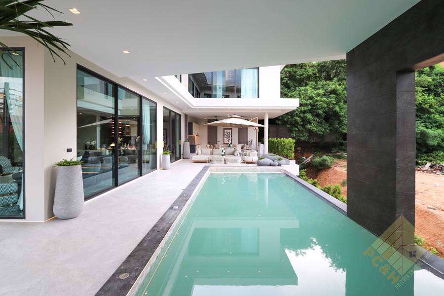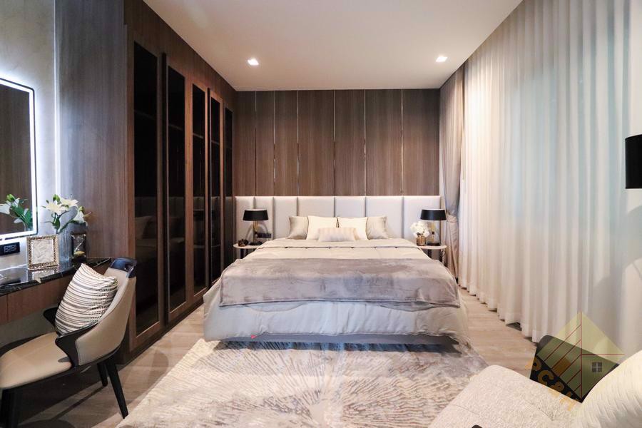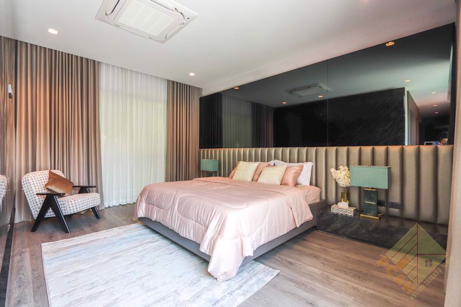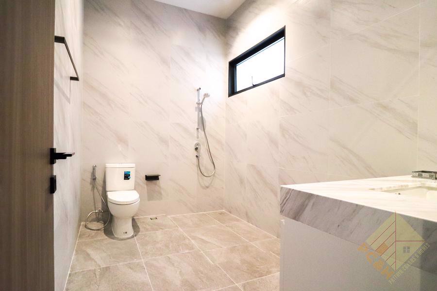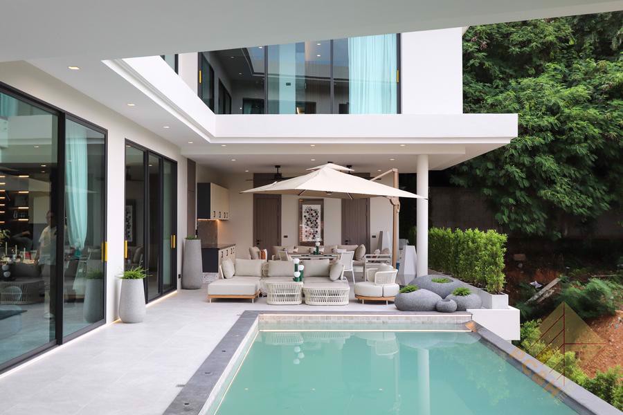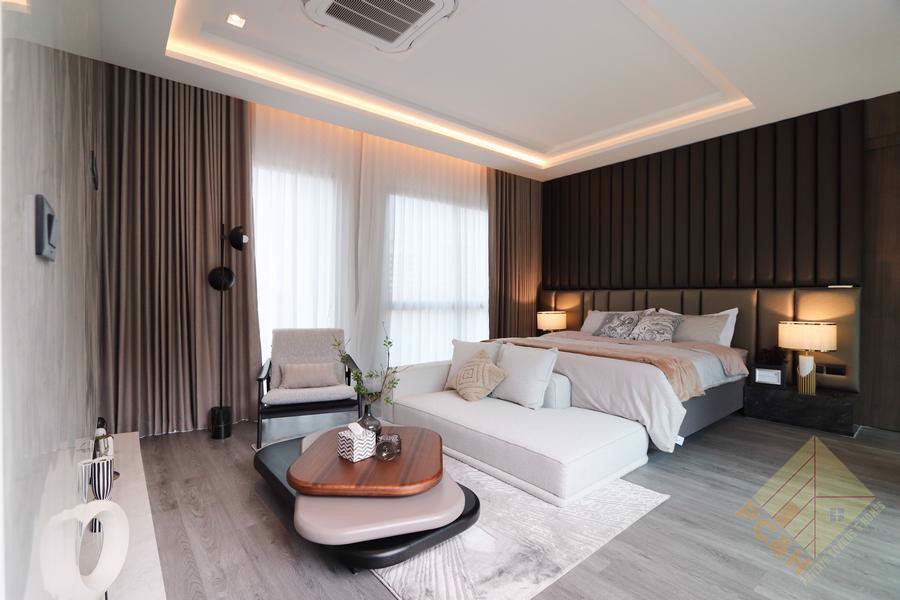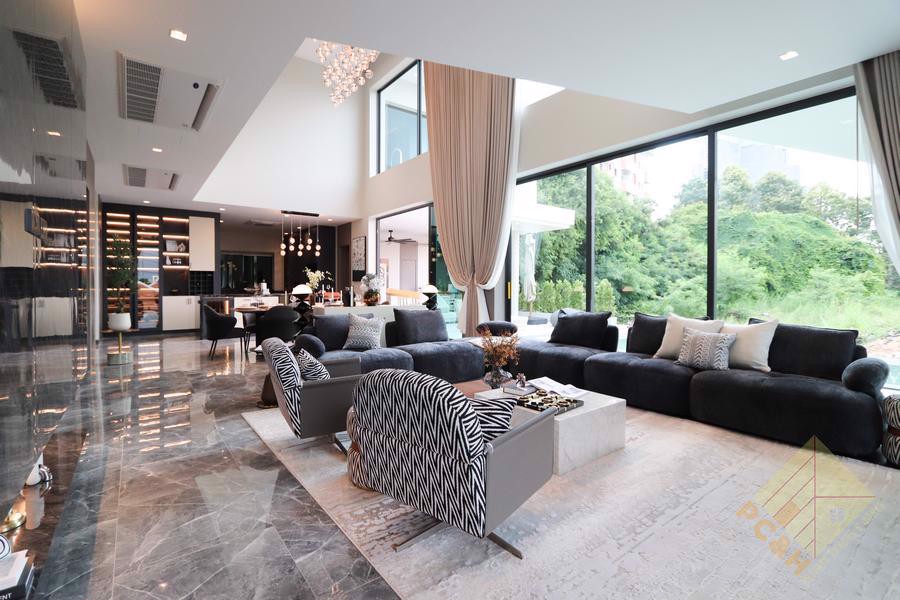 This 3-storey home features 6 bedrooms and 9 bathrooms with a total usable area of 1,200 square meters. It offers a spacious living room, a large built-in European kitchen, and a separate Thai kitchen. There is also a guest bathroom and a private swimming pool on the second floor, complete with a BBQ balcony.