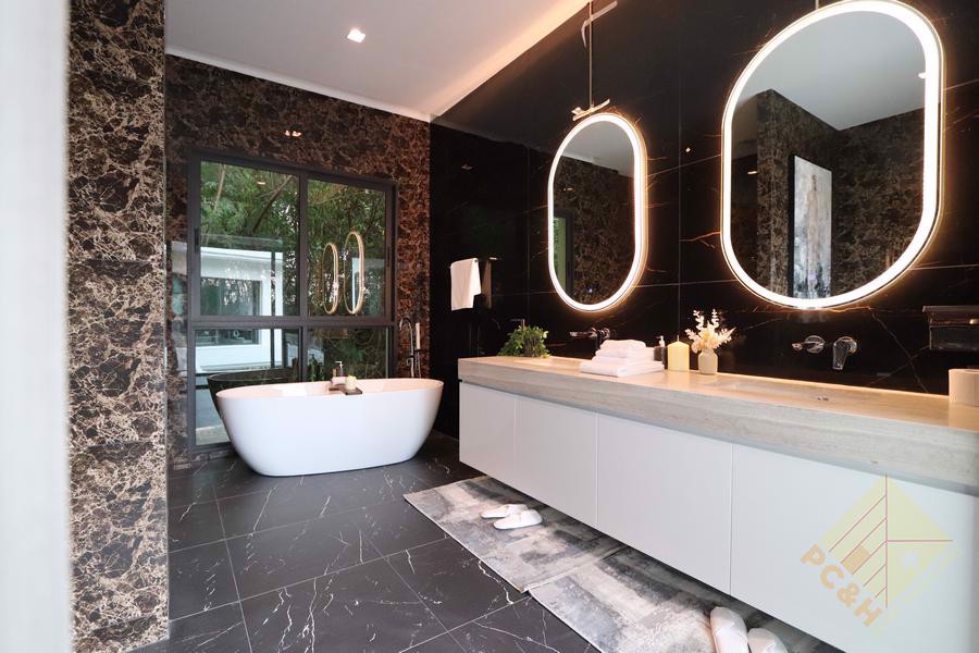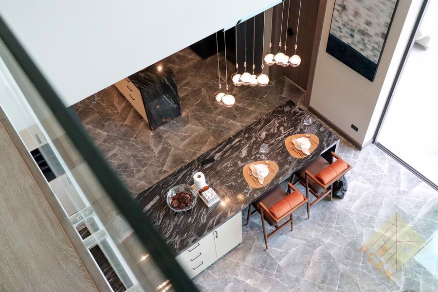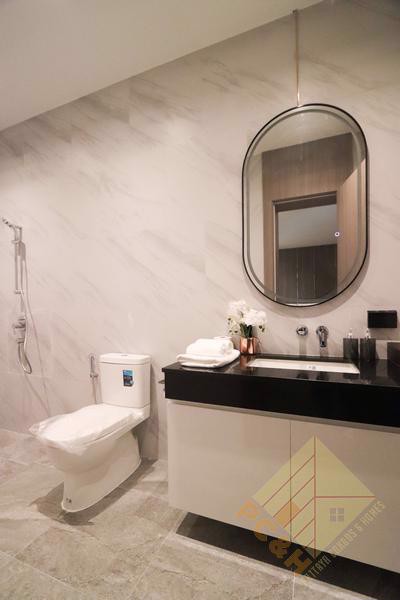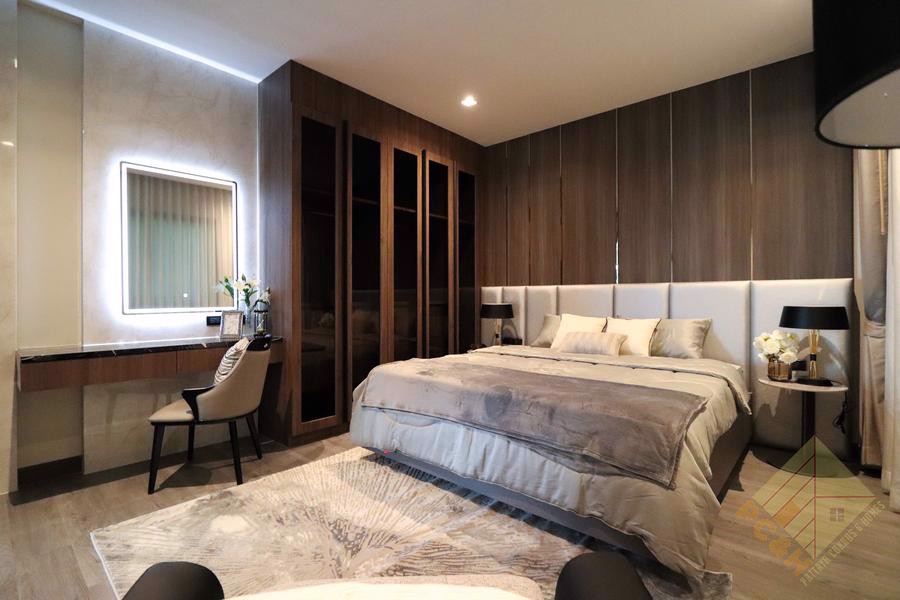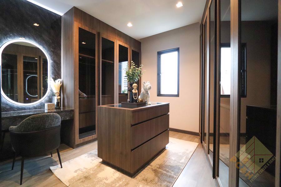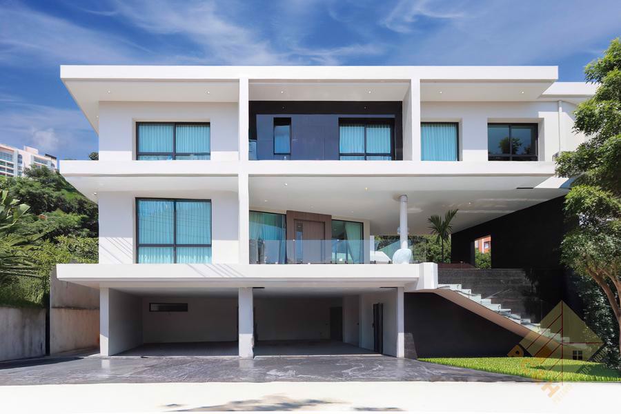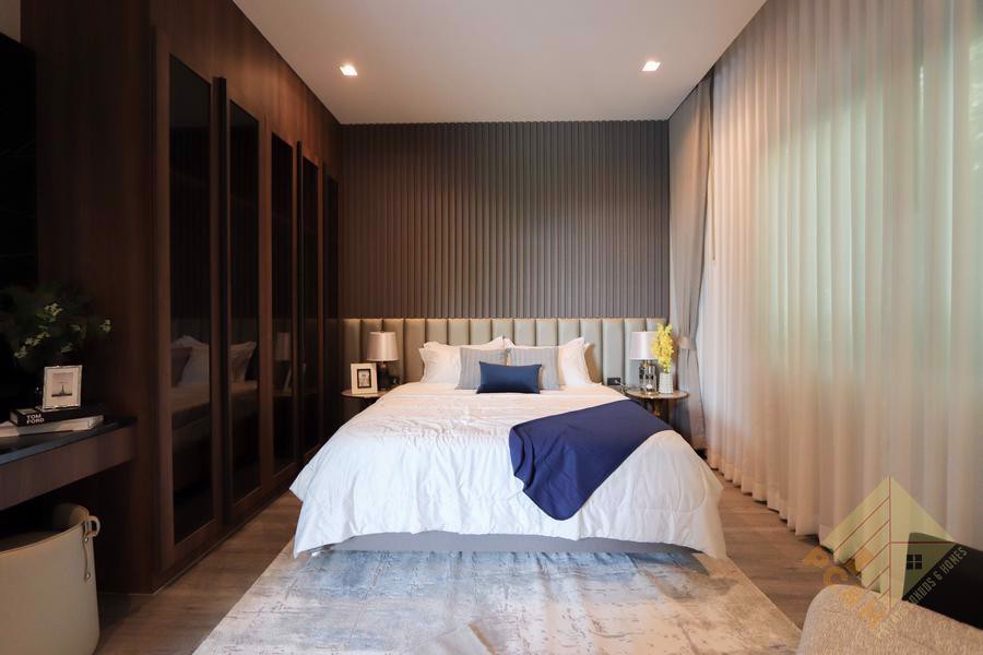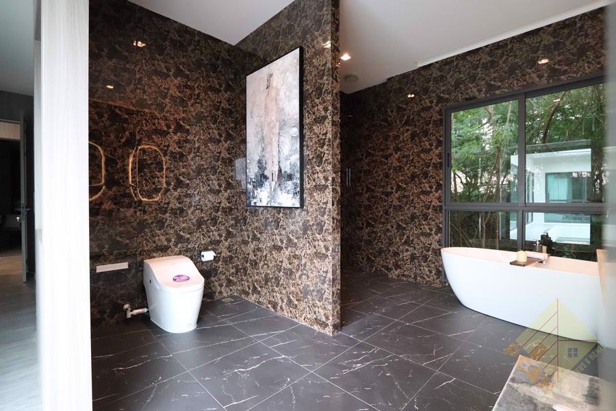 This 3-storey home features 6 bedrooms and 9 bathrooms with a total usable area of 1,200 square meters. It offers a spacious living room, a large built-in European kitchen, and a separate Thai kitchen. There is also a guest bathroom and a private swimming pool on the second floor, complete with a BBQ balcony.