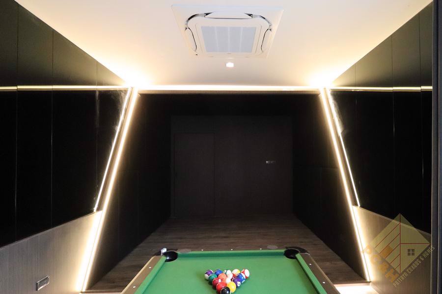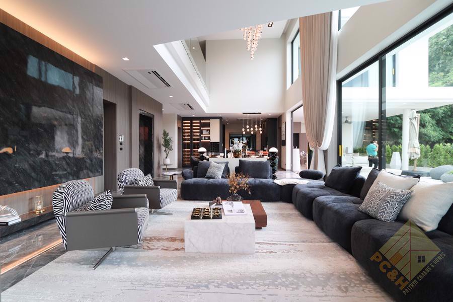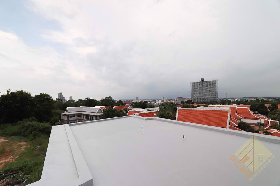 The house includes a large entertainment room with a bar, pool table, golf simulator, and shuffleboard game. The rooftop terrace provides a stunning 270-degree view of Pattaya city. The property is fully furnished with high-quality furniture, as shown in the photos.