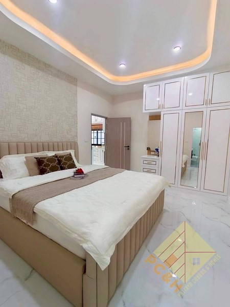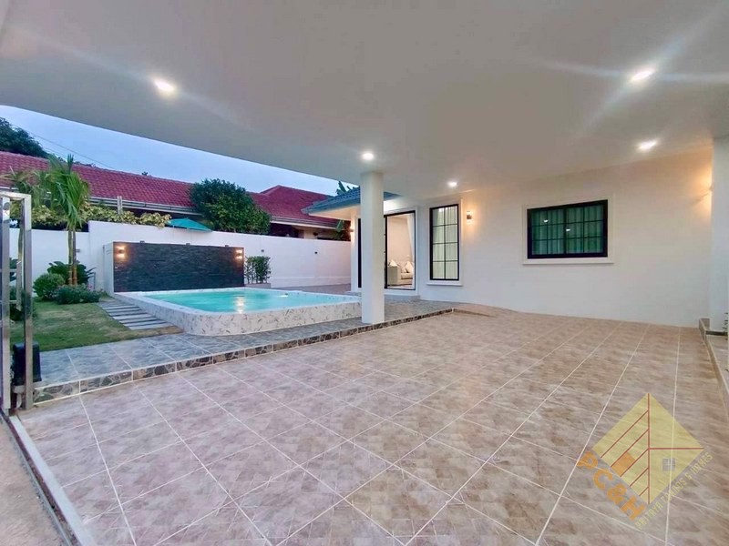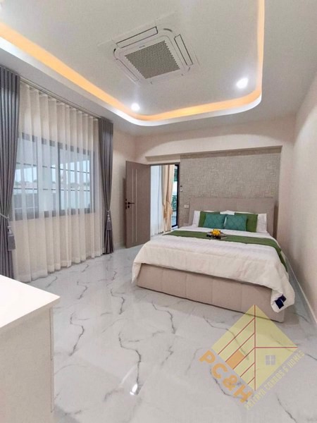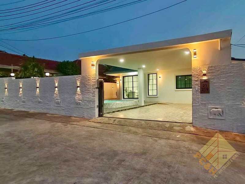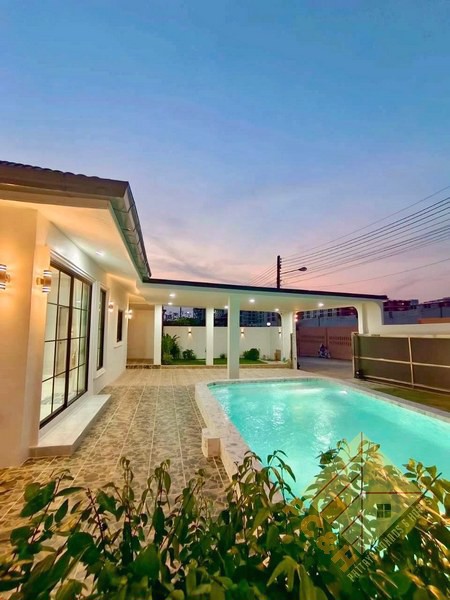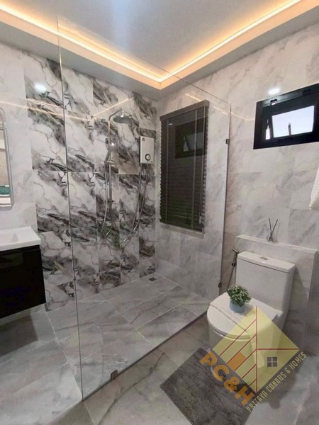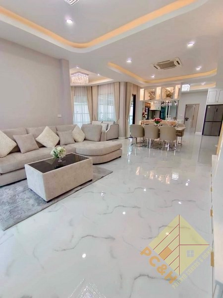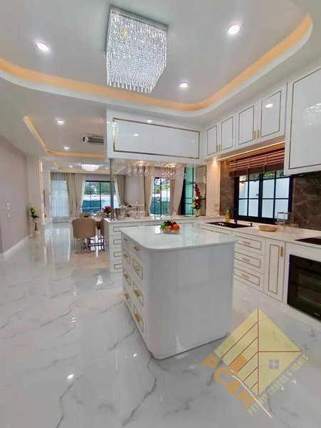 This house has 4 bedrooms and 5 bathrooms. It includes both a European-style kitchen and a Thai kitchen, as well as a jacuzzi. All rooms are fully furnished as shown in the pictures. The interior living area is approximately 220 square meters.