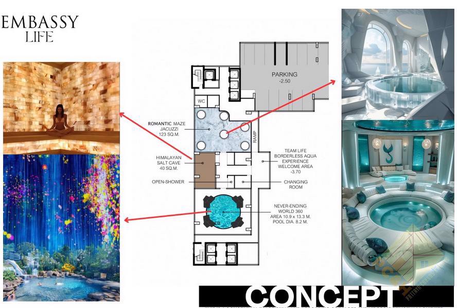Embassy Life will consist of 3 building, 24 storeys high. Embassy is subsequently full of facilities, swimming pools, water terraces, cave pool, moet bar, gym & locker, holistic spa, jacuzzi, romantic maze jacuzzi, floating yoga on lotus pond, never-ending world 360, himalayan salt cave, team life borderless aqua experience.