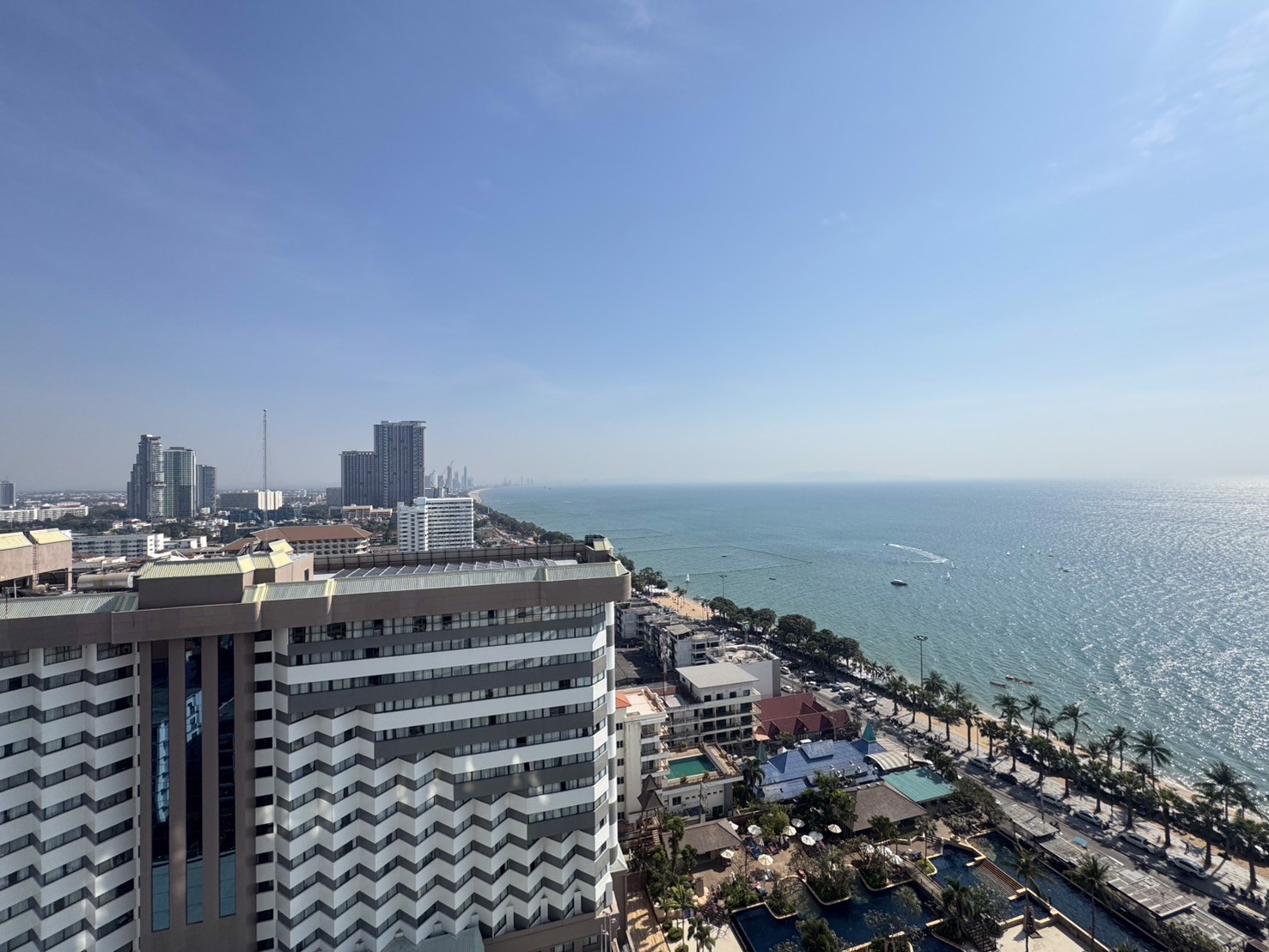 Jomtien Plaza Condotel has been standing since 1990. It is a well-managed condo with a total of just 284 units over its 25 floors. The main feature would be its large, elevated communal pool at the front of the development that also offers stunning panoramic beach views.
