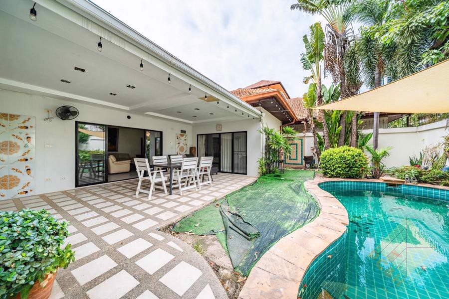 This house sits on a 85.25 TW (341 sq.m) plot of land. This house has its own private pool with an outdoor area, great for alfresco dining and entertaining. There is parking next to the house. The village has security guards for added safety and common swimming pool.