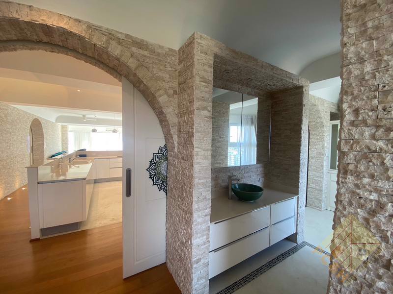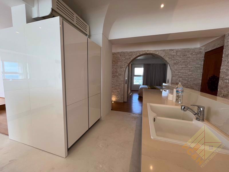 This is a 199sqm, 2 bed, corner unit with an extremely spacious feel to it. On entering this condo from just behind the kitchen area you are immediately taken back by the sense of spaciousness and the cutting edge design of the unit. As you can see from the pictures, the kitchen, dining and living area are in an open plan formation. The bi-folding doors are double glazed and have been designed so that they can be completely concealed to really open up the stunning sea and city views.