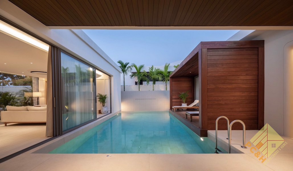 This house is on a land plot of 130 TW (520 sq.m) and also features a private saltwater swimming pool measuring 8.9 x 4.7 meters, complete with an integrated Jacuzzi for ultimate relaxation. There is covered parking for 2 cars inside the property, along with additional guest parking available throughout the project. The community offers 24-hour security for your peace of mind, as well as a convenient buggy service for residents and guests. Best of all, there are no common area fees.