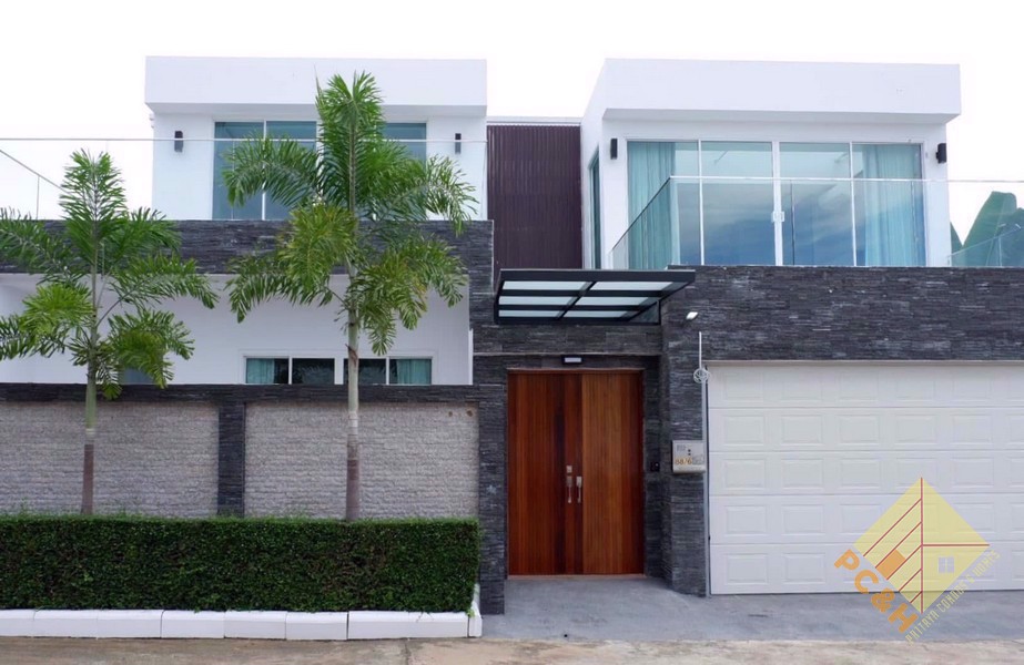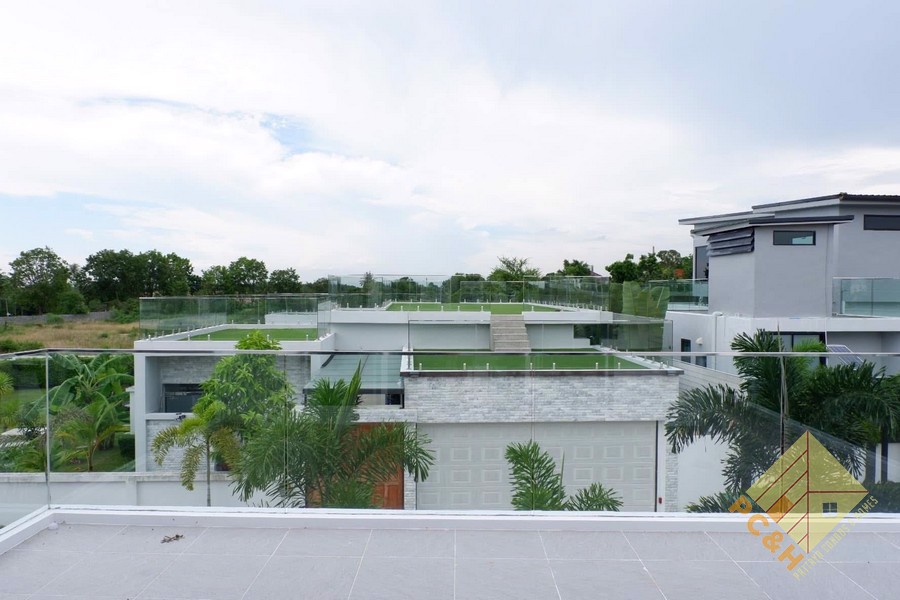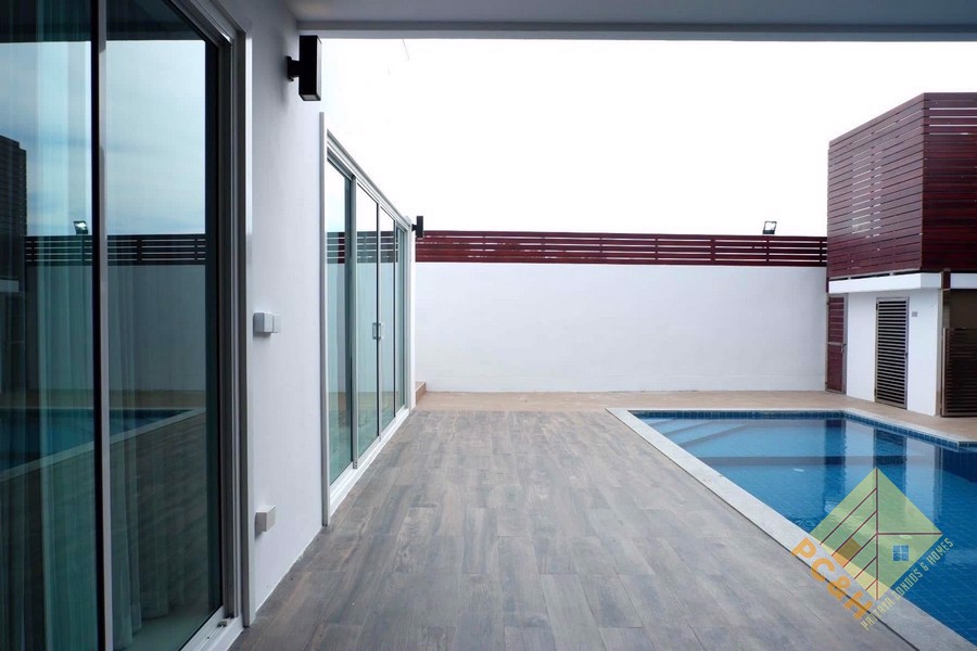 The villa sits on a 398.4 sq.m. (99.6 sq.w. ) meter plot of land, featuring a large swimming pool on the side and a 2-car garage. It features a digital door lock, a waterfall curtain system, and a barbecue area.