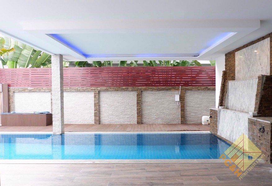 This pool villa offers approximately 486 sq.m. of living space, including 4 bedrooms, 5 bathrooms, a Jacuzzi, an I-Spa and I-Rain shower system, a Thai-Western kitchen, a pet room, and a maid's room. The villa features modern interiors.