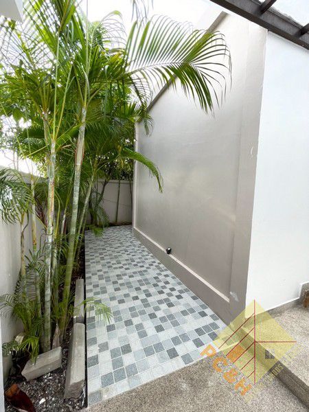 This villa is on the 400 square meter land plot that has a large swimming pool on the side and a garage in front of the villa.