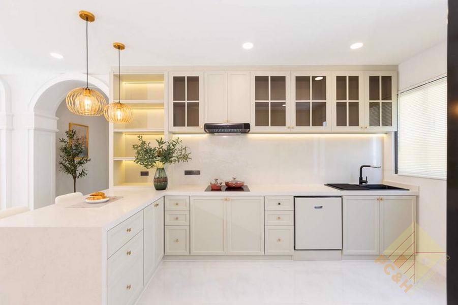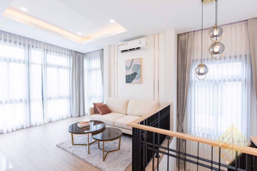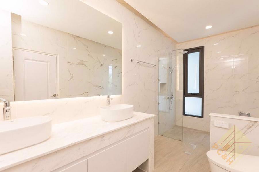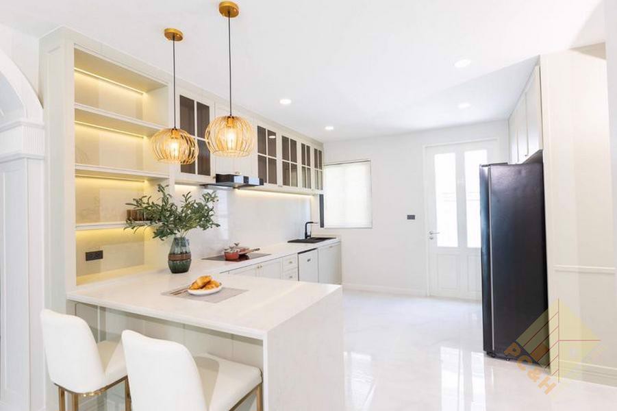This two-storey house has 3 bedrooms, 5 bathrooms, and a total usable area of 260 square meters. It features a spacious living room and a built-in European-style kitchen and it comes fully furnished.