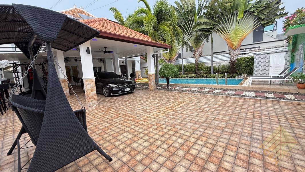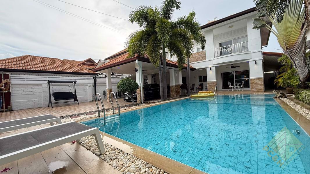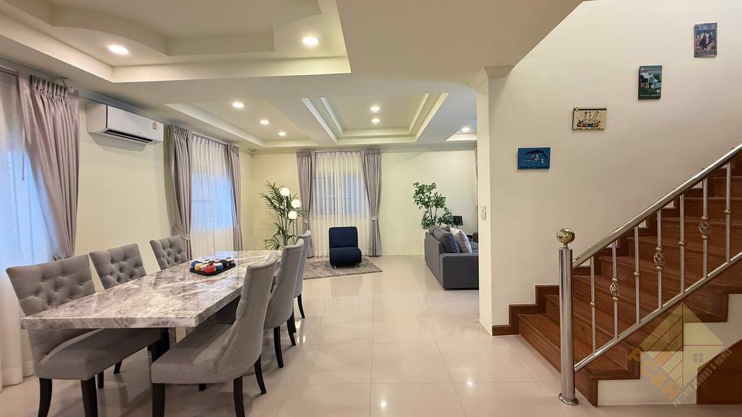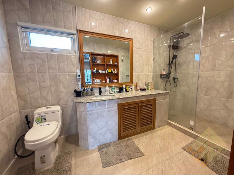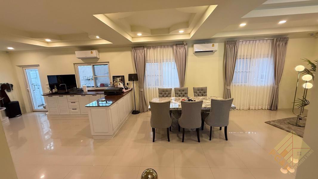 This hosue has 2 Storeys, 3 bedrooms, 4 bathrooms with a 370 Sqm, spacious living room, 2 kitchens (Thai kitchen & European kitchen) and it comes fully furnished,For sale with partial furniture as you can see in the pictures.