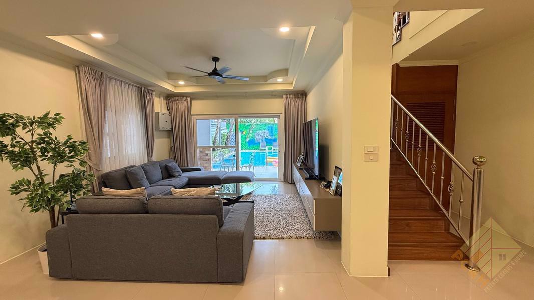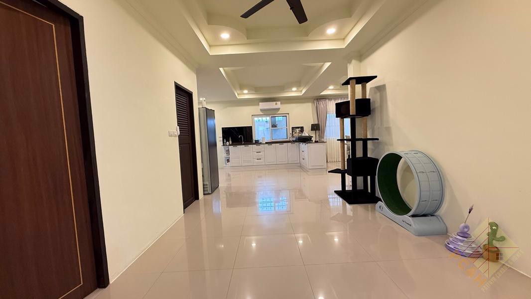 This house has a covered parking and this village is only 500 meters from the market, easy to travel to. This house has a land plot of 100 TW ( 400 Sqm) and private swimming pool.The entrance to the village has a Limoth door, furniture as pictured.