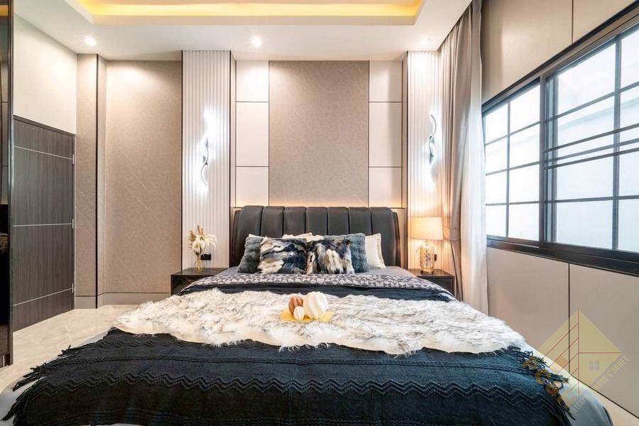 This house sits on a 80 TW (320 sq.m) land plot. The house has covered parking and a private swimming pool. The village has 24-hour security.