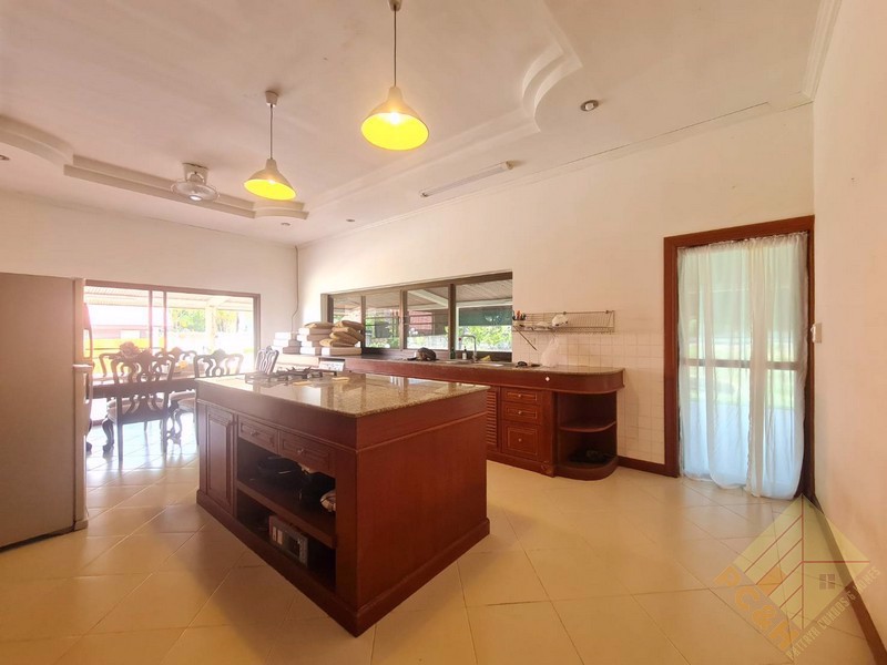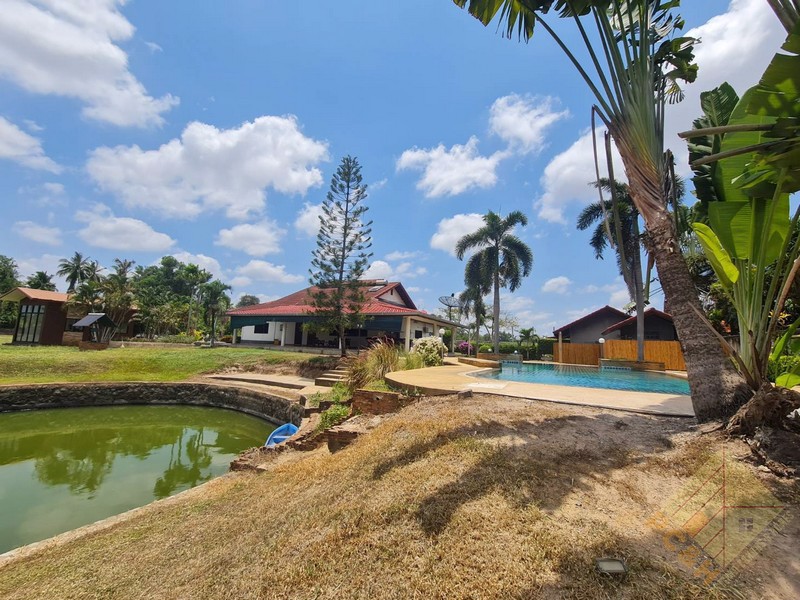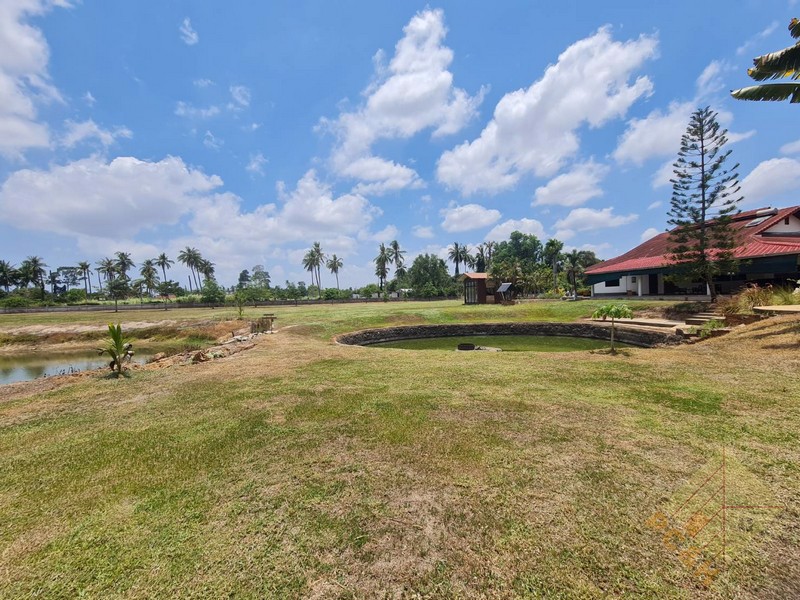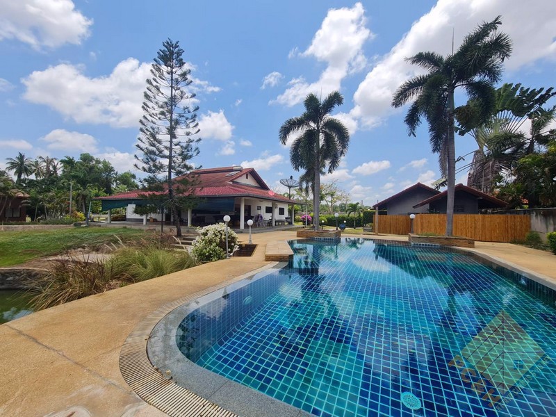 This house sits on a 7 rai 2,800 TW (11,200 sq.m) plot of land. There is covered parking and this house has a private pool.