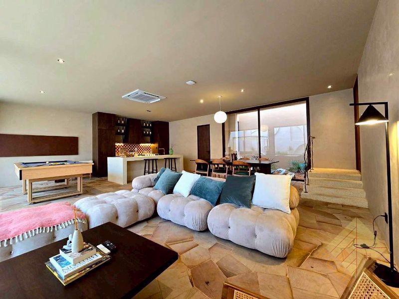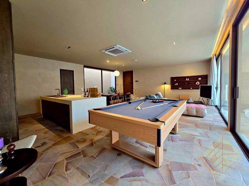 This house features 5 bedrooms, 6 bathrooms, and a total usable area of 550 square meters. It offers a spacious living room, a built-in European kitchen, and a pool table. The house comes fully furnished and decorated as shown in the photos.