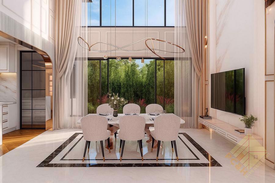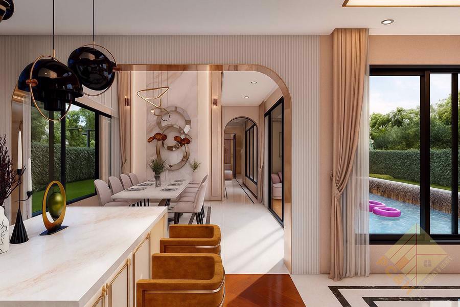 This house offers 8 bedrooms, 9 bathrooms, and a total living area of 525 sq.m. It features a spacious living room, a built-in European kitchen. The property is fully furnished with high-quality furniture, as shown in the photos.