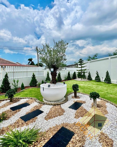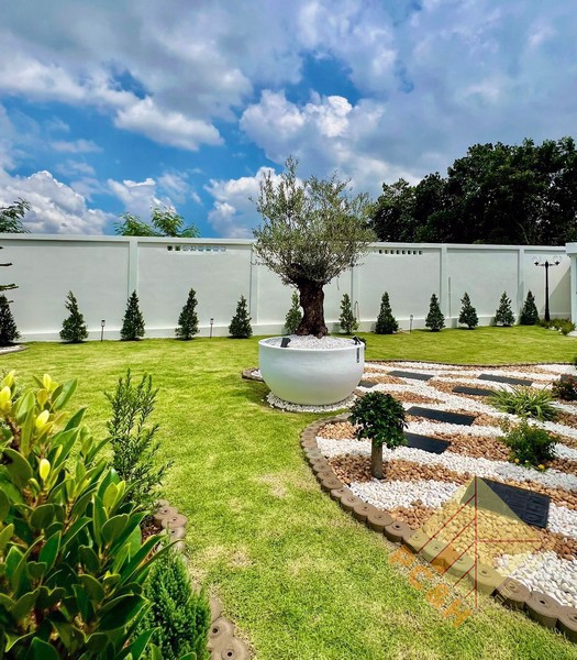 This house sits on a land plot of 83 TW (332 sq.m) This home features a beautiful stone garden with a magnificent Ohiblanca Olive Tree, imported from Spain and aged approximately 150–200 years.