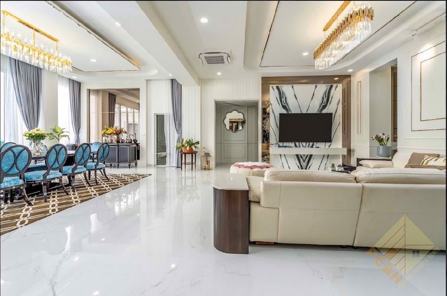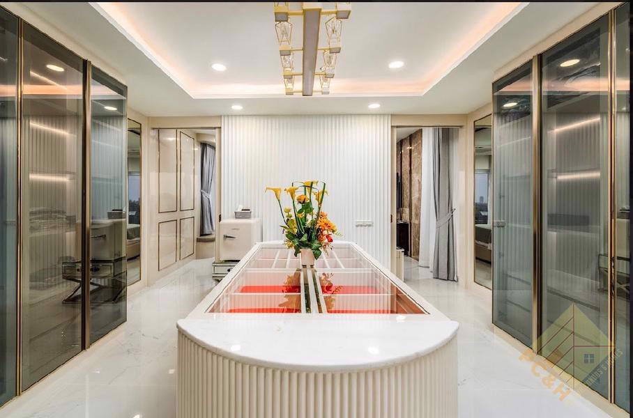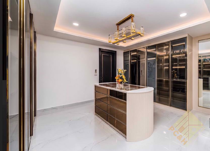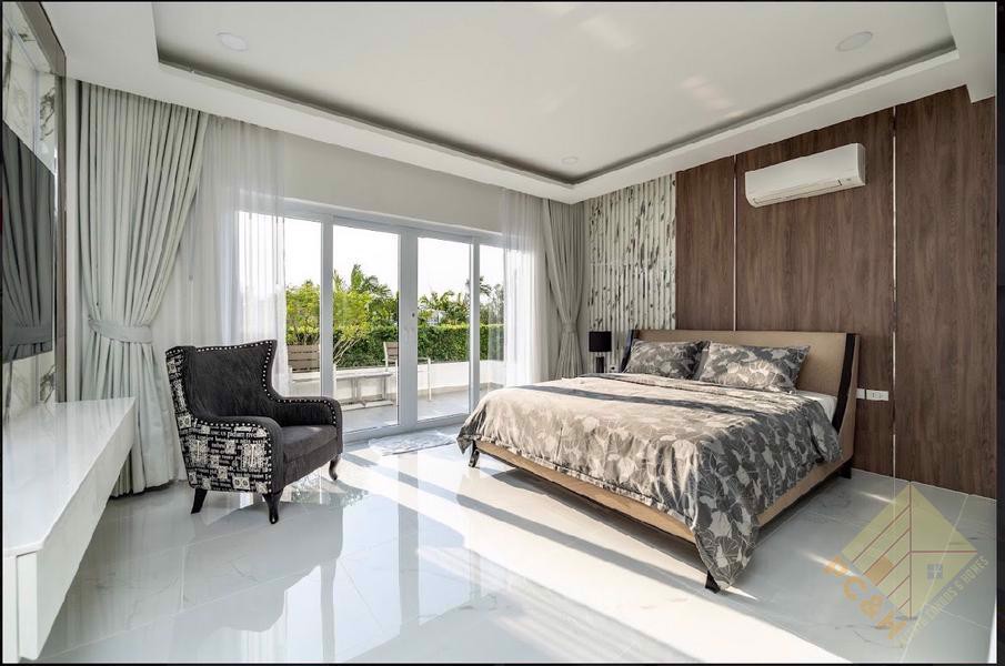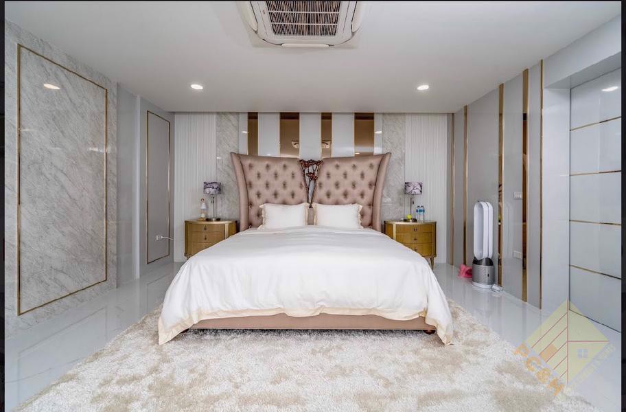 This is a 7-bedroom, 9-bathroom house with built-in furniture in every bedroom. The villa also features an office room, ample storage spaces, a guest WC, and separate maid quarters complete with Thai kitchen facilities and a spacious, modern European kitchen. In total, this property offers approximately 950 sq.m of living space.