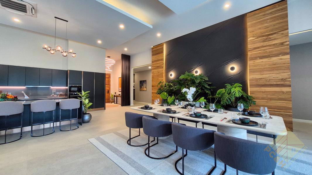 - Expansive 170 sq.m open-plan main living area with 4-meter high ceilings and a striking teak-accented feature garden wall