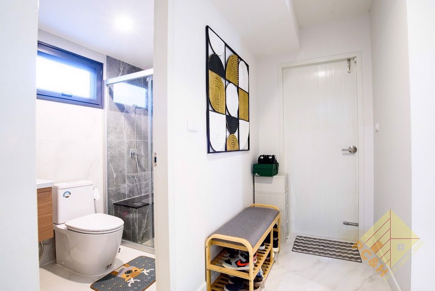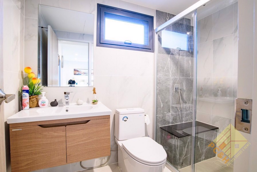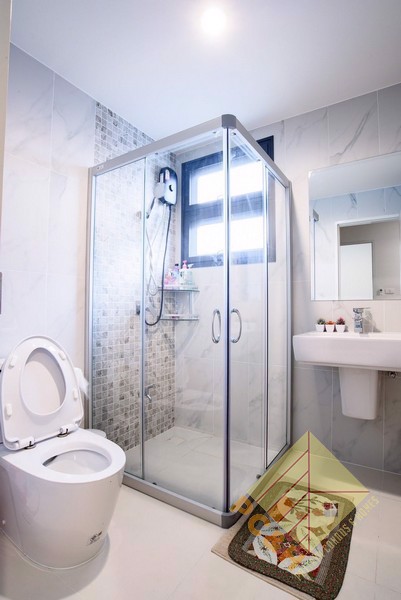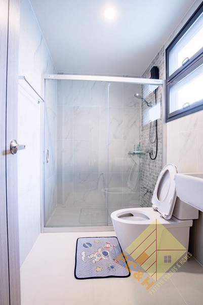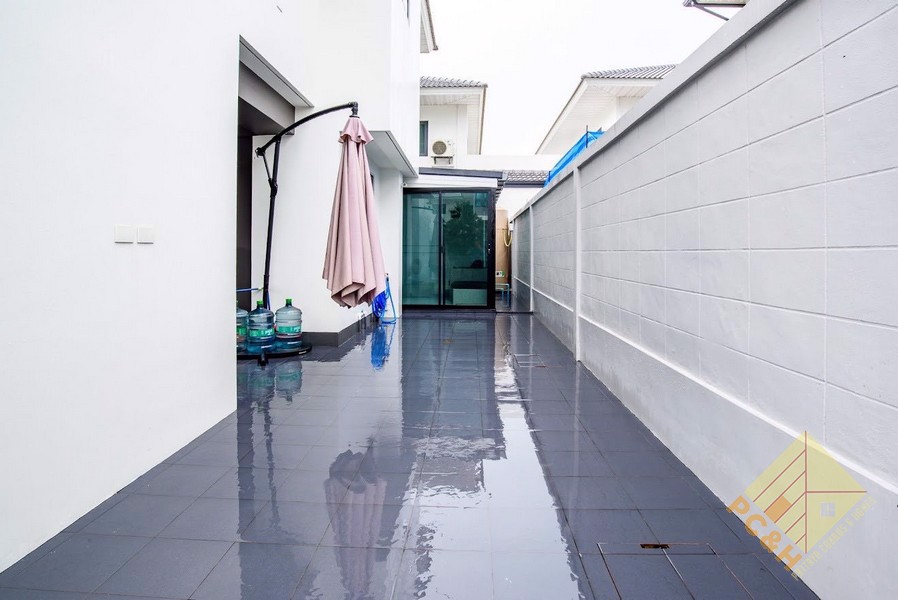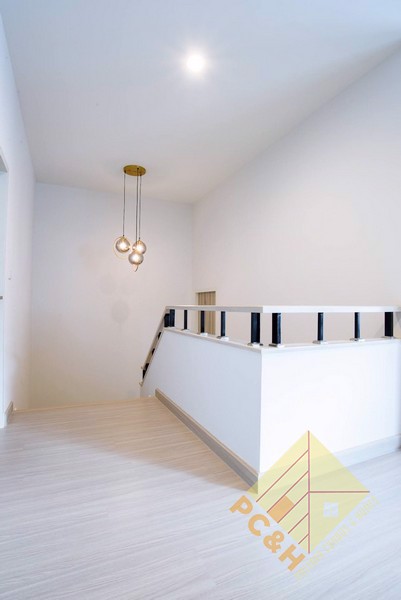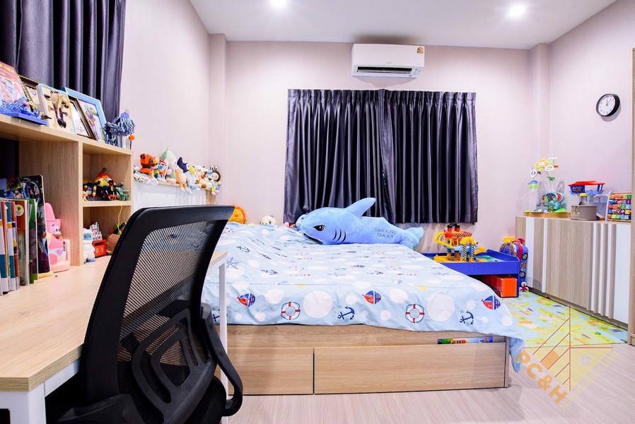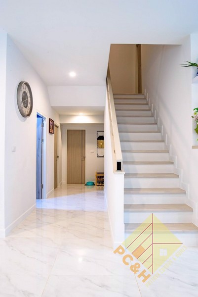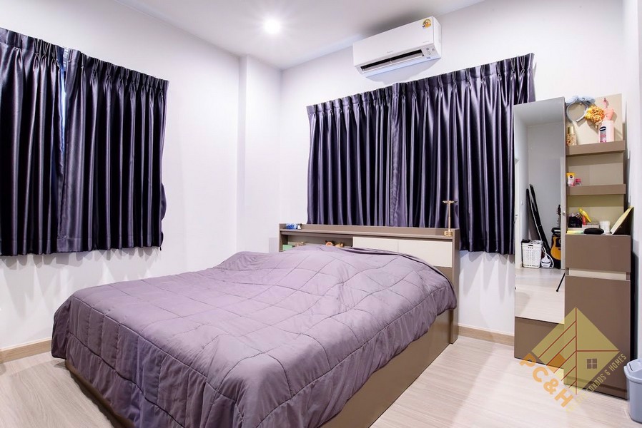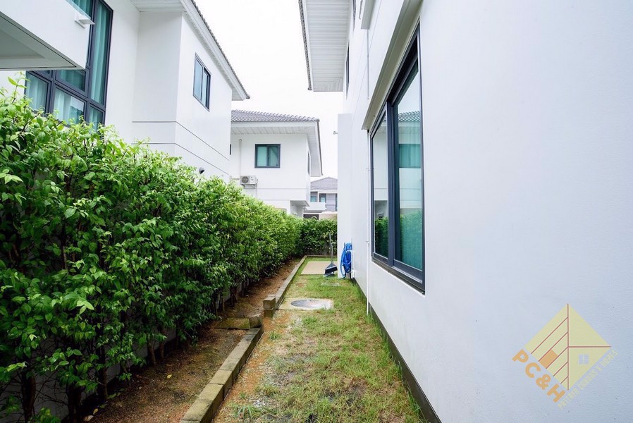 This house is on a land plot of 59.8 TW (239.2sq.m) and has a communal swimming pool, fitness, car parking, and security guards. 24 hrs.