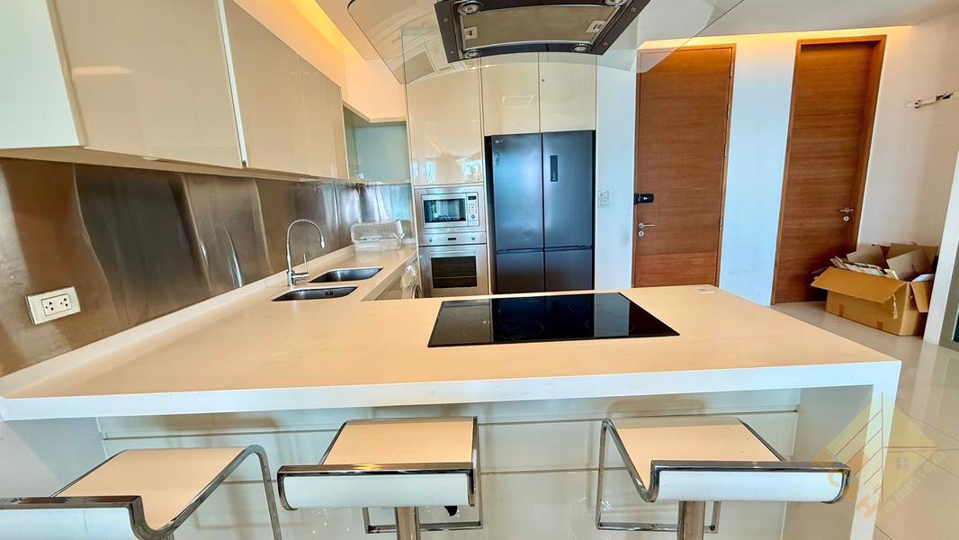 The condo is bright and airy, featuring floor-to-ceiling windows that maximize natural light and stunning views. It boasts 2 spacious bedrooms with ensuite bathrooms, plus an additional guest bathroom. The open-plan layout seamlessly combines a modern kitchen, dining, and living area, all leading out to a large balcony overlooking the beach.