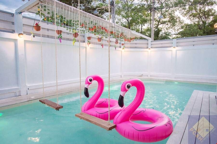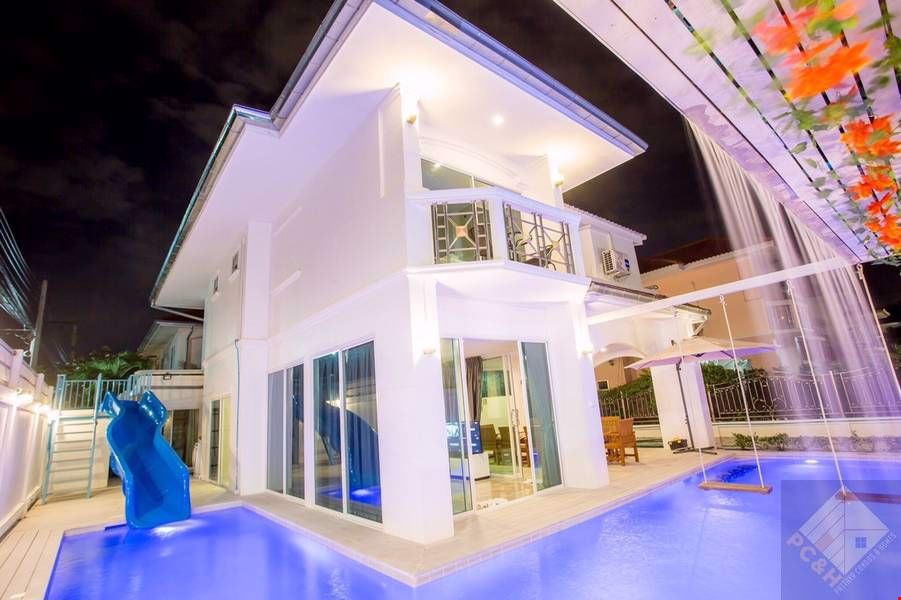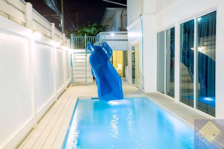 Out side the house has a private swimming pool with a big yellow slidder on the side.