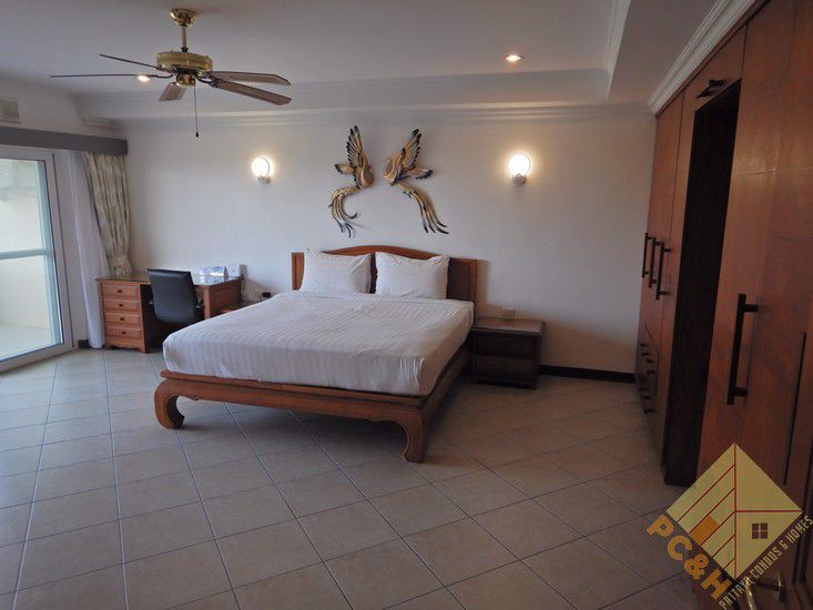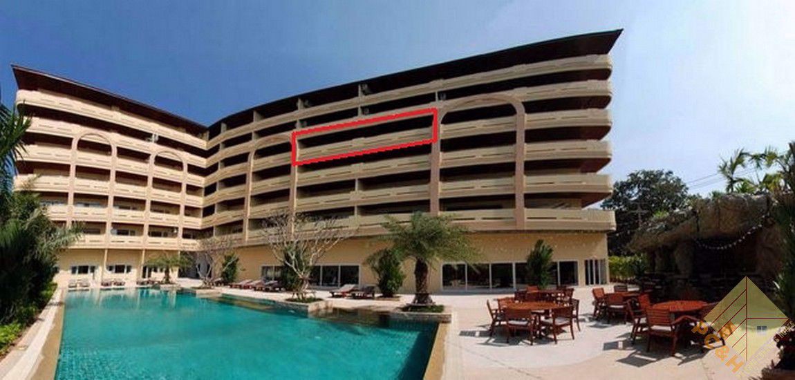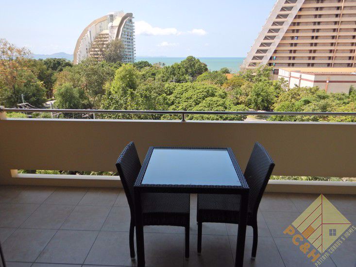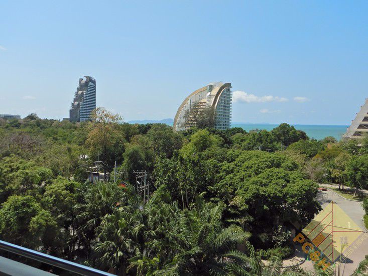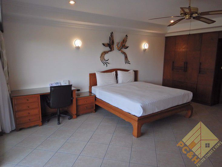 This is a 112 sqare meter unit on the 5th floor that has garden and sea view from the balconey. It has 1 large bedroom and 2 bathrooms which comes furnished in Thai style.