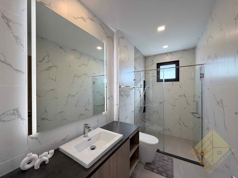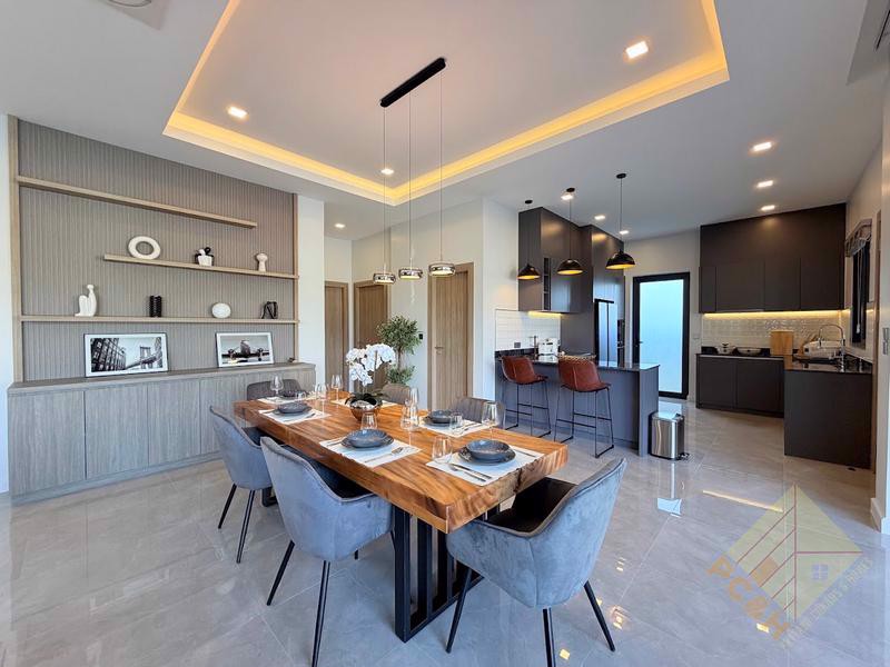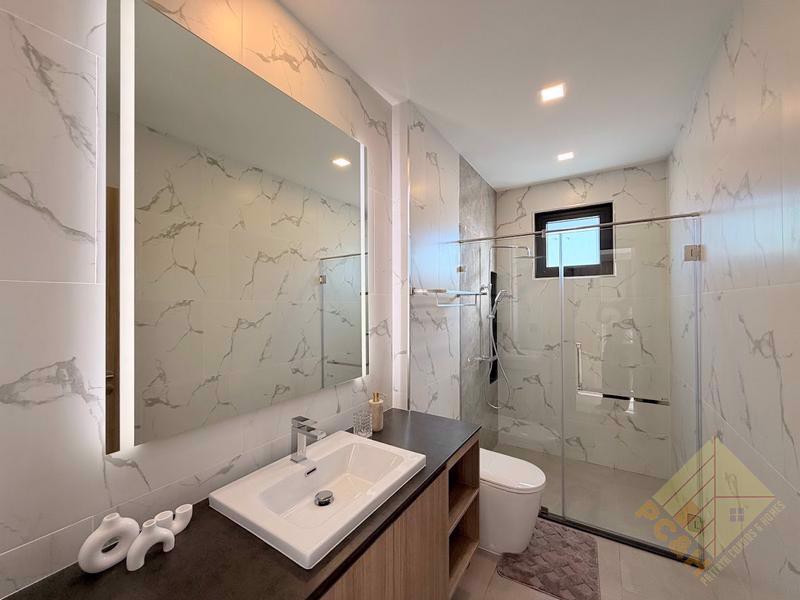 This house is classed as a type A at Zensiri Lakeside Mabprachan, which is the most common house type available within the project. House Type A offers a usable area of 238.60sqm, with 3 bedrooms and 4 bathrooms. The kitchen is in an open plan format with the dining and living area. There is also a pantry and store room located just next to the kitchen. Standard house inclusions are: