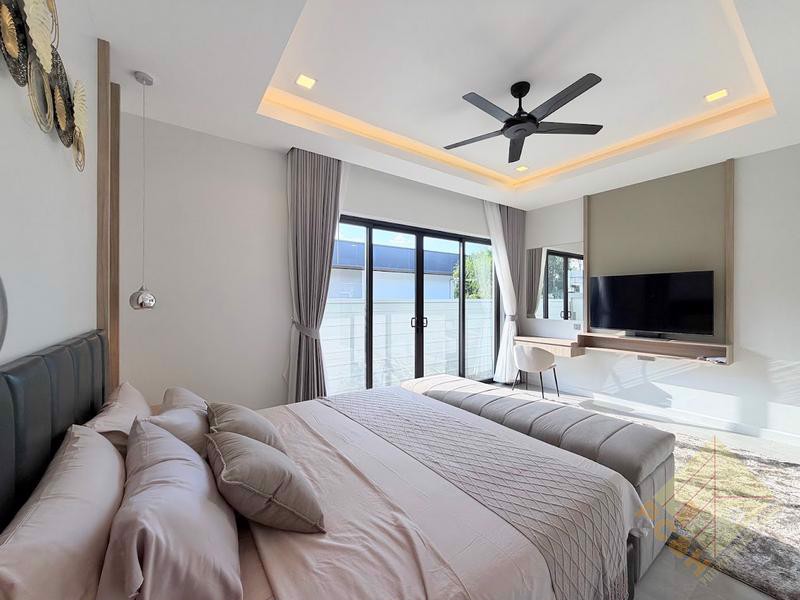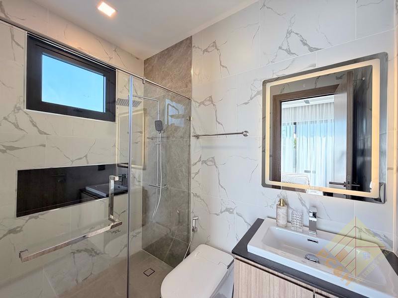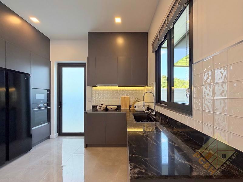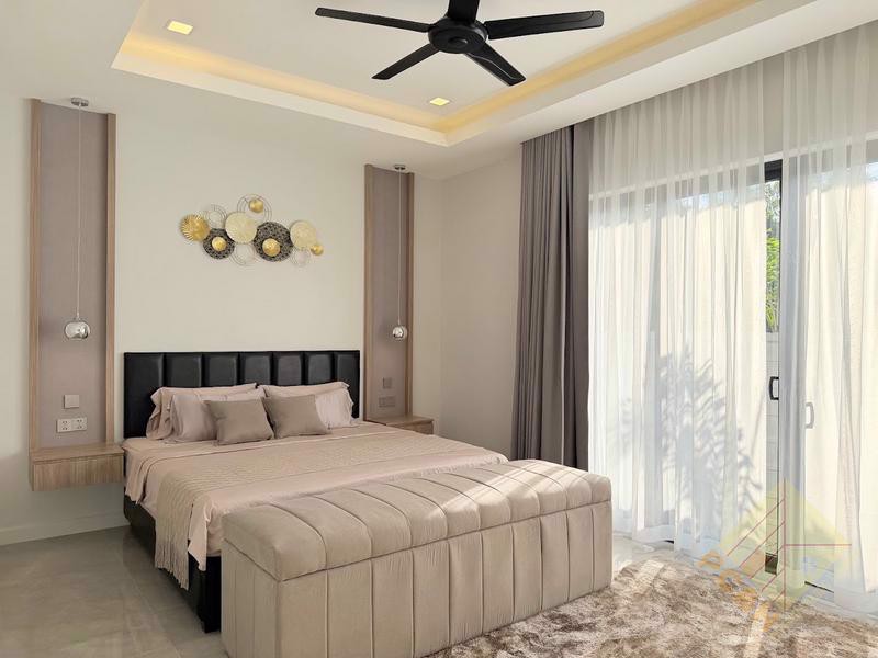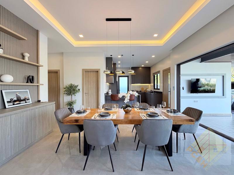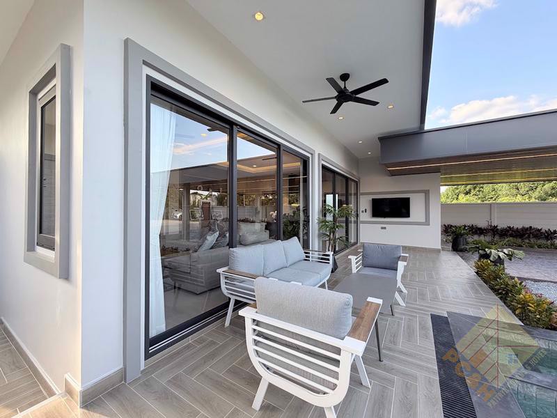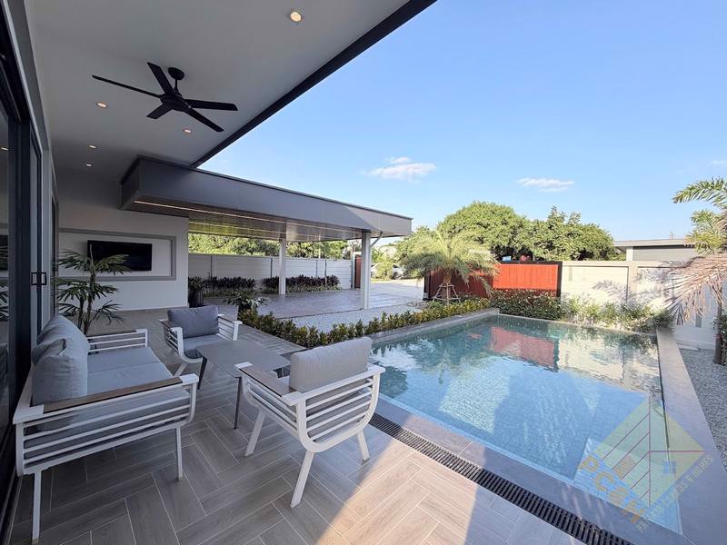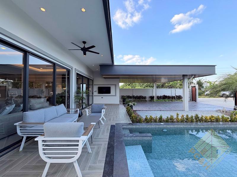 This modern, single storey house sits on a land plot of 105 TW (420 sq.m) and boasts a private swimming pool surrounded by a nice terrace and tropical landscaping and a double car park. The size of the terrace and pool in house Type is just over 80sqm.