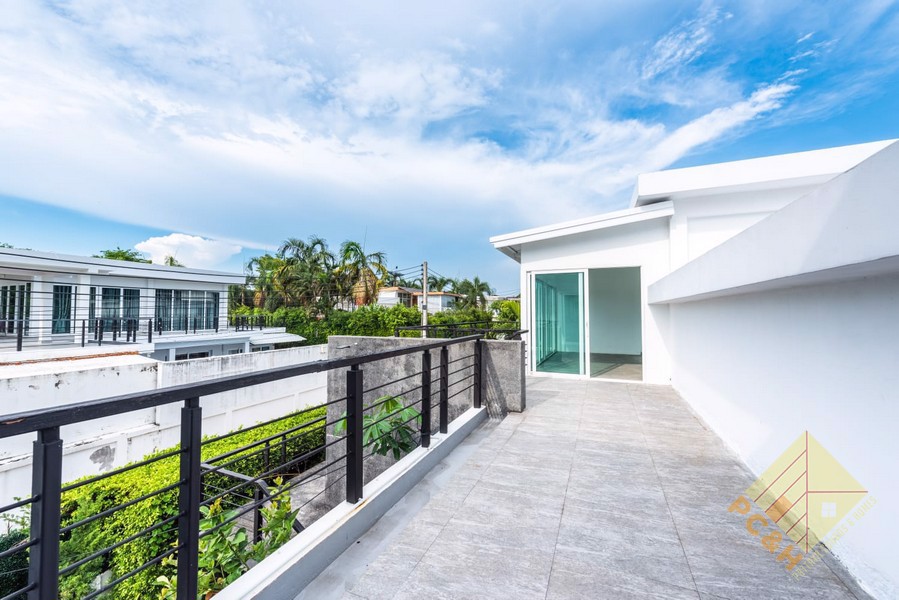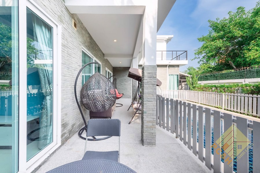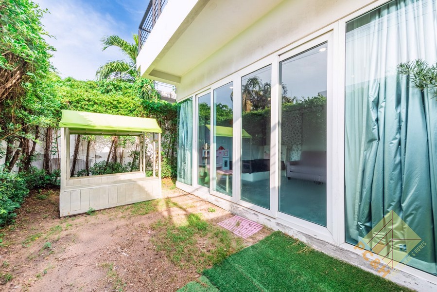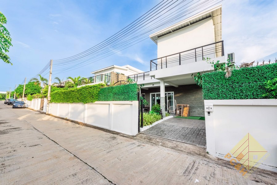 ภายนอกบ้านตั้งอยู่บนที่ดินขนาด 123 ตร.ว. (492 ตร.ม.) มีสระว่ายน้ำส่วนตัว สวนกลางแจ้งกว้างขวาง และที่จอดรถภายในบ้าน 3 คัน ประตูบ้านมีระบบล็อคอัตโนมัติ หมู่บ้านมีระบบรักษาความปลอดภัยตลอด 24 ชั่วโมง และมีสภาพแวดล้อมที่เงียบสงบ เหมาะสำหรับครอบครัวที่ต้องการความเป็นส่วนตัวและสถานที่อยู่อาศัยที่เงียบสงบ