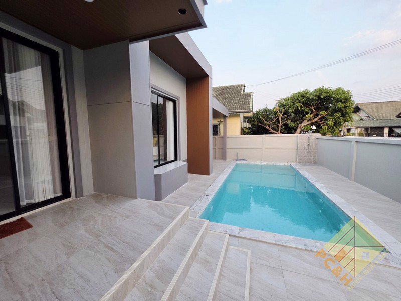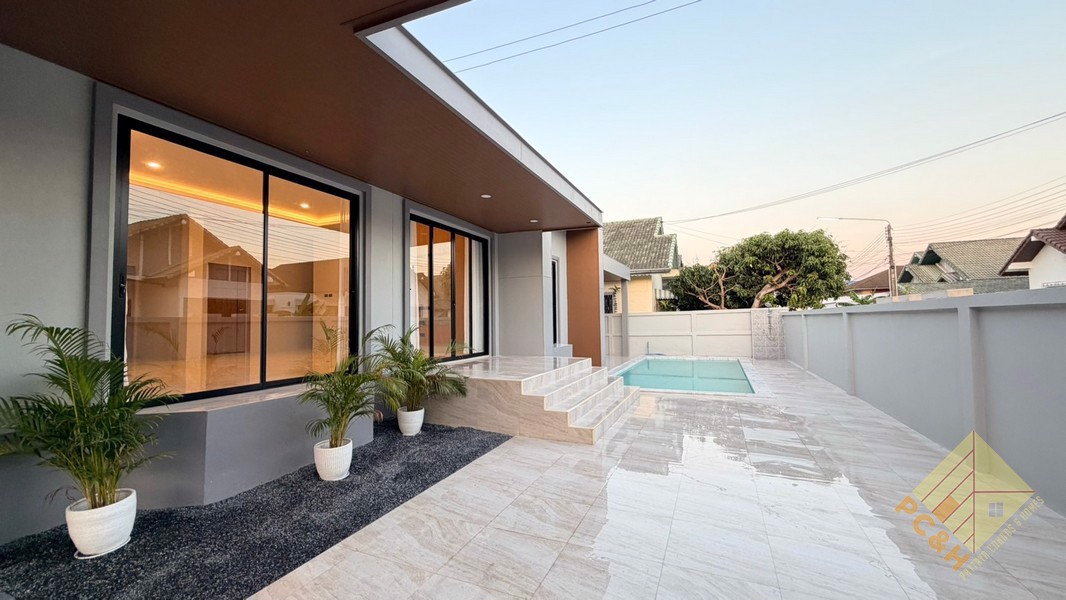 ภายนอกบ้านตั้งอยู่บนที่ดินขนาด 129 ตร.ว. (516 ตร.ม.) มีสระว่ายน้ำส่วนตัวขนาด 3.5 x 7 เมตร มีที่จอดรถภายในบ้านสำหรับ 2 คัน และพื้นที่ด้านข้างกว้างขวางซึ่งสามารถดัดแปลงเป็นสวนส่วนตัวได้ บ้านหลังนี้ติดตั้งประตูอัตโนมัติควบคุมด้วยรีโมท เหมาะสำหรับครอบครัวที่ต้องการสภาพแวดล้อมการอยู่อาศัยที่เงียบสงบและเป็นส่วนตัว โดยหมู่บ้านมีระบบรักษาความปลอดภัยตลอด 24 ชั่วโมง