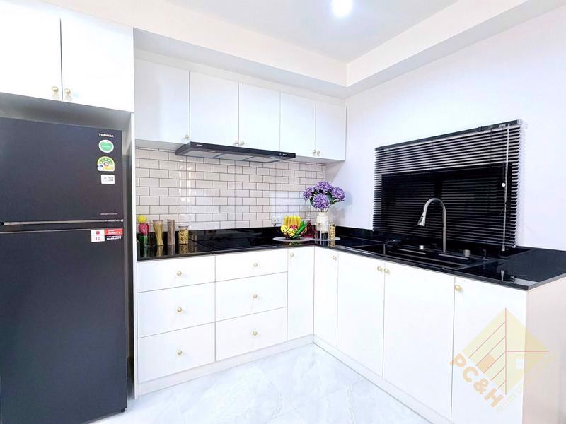 บ้านหลังนี้มี 3 ห้องนอน 2 ห้องน้ำ และพื้นที่ใช้สอยรวม 200 ตร.ม. มีห้องนั่งเล่นกว้างขวางและห้องครัวสไตล์ยุโรปแบบบิวท์อิน พร้อมเฟอร์นิเจอร์ครบครัน