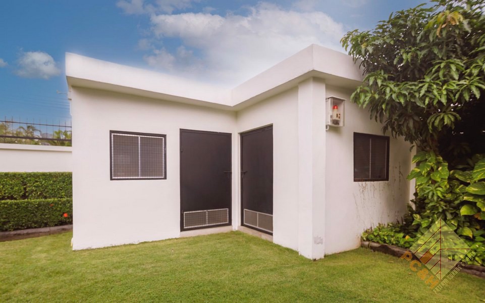 ภายนอกที่ดินแปลงนี้มีพื้นที่ 290 ตารางวา (1,160 ตร.ม.) มีที่จอดรถสำหรับ 2 คัน และมีสระว่ายน้ำระบบน้ำเกลือ นอกจากนี้ยังมีระบบรักษาความปลอดภัยตลอด 24 ชั่วโมงและสวนที่จัดภูมิทัศน์อย่างสวยงาม ที่พักแห่งนี้ยังให้ความเป็นส่วนตัวสูง