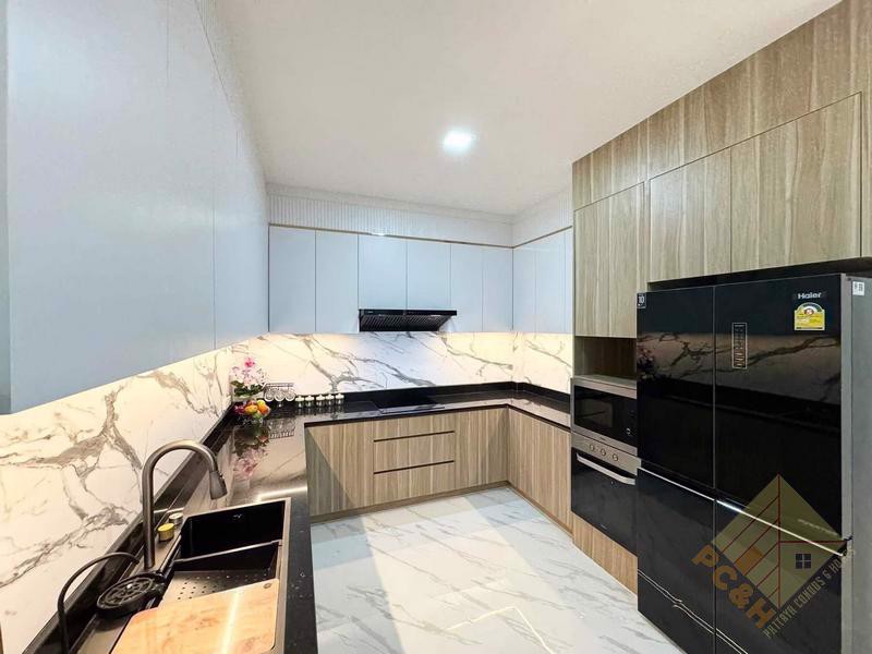 บ้านหลังนี้มี 5 ห้องนอน 6 ห้องน้ำ และพื้นที่ใช้สอยรวม 304 ตร.ม. มีห้องนั่งเล่นกว้างขวางและห้องครัวสไตล์ยุโรปแบบบิวท์อิน พร้อมเฟอร์นิเจอร์ครบครัน
