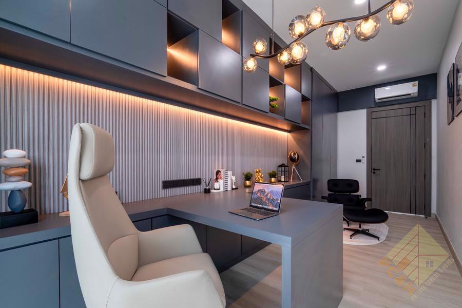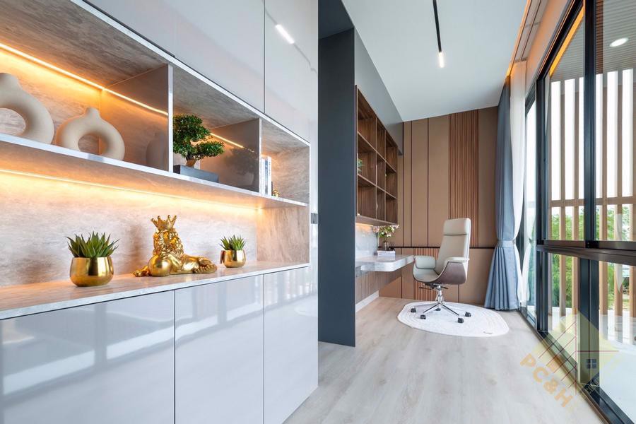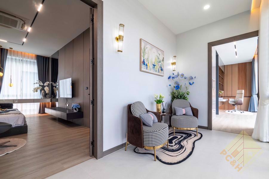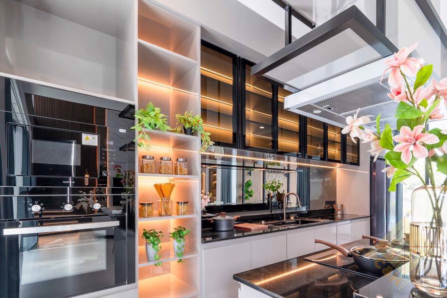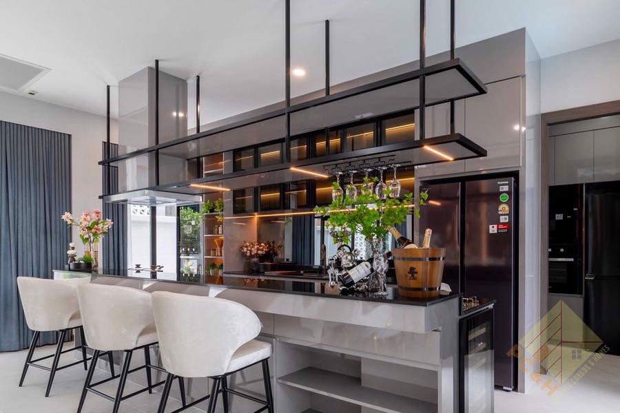 บ้านหลังนี้มี 4 ห้องนอน 5 ห้องน้ำ และพื้นที่ใช้สอยรวม 589 ตร.ม. มีห้องนั่งเล่นกว้างขวาง และห้องครัวสไตล์ยุโรปแบบบิวท์อิน พร้อมเฟอร์นิเจอร์ครบครัน